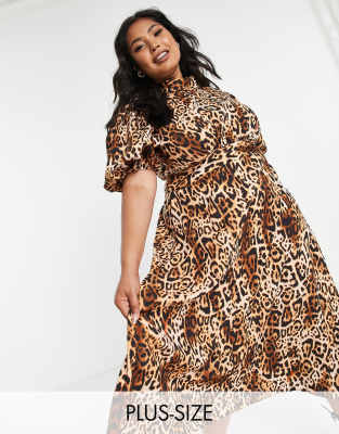 John Zack Plus Exclusive Puff Sleeve Midi Dress In Leopard Print Multi Modesens